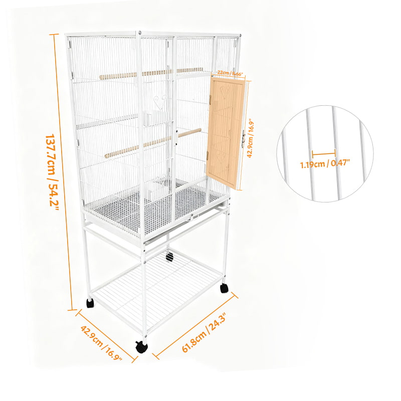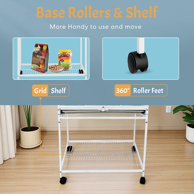2. 安全可靠且移动灵活:顺滑的锁定系统比传统锁具更精准安全,防止鹦鹉意外打开笼子。360°万向轮和底部储物架方便移动和存放宠物用品。