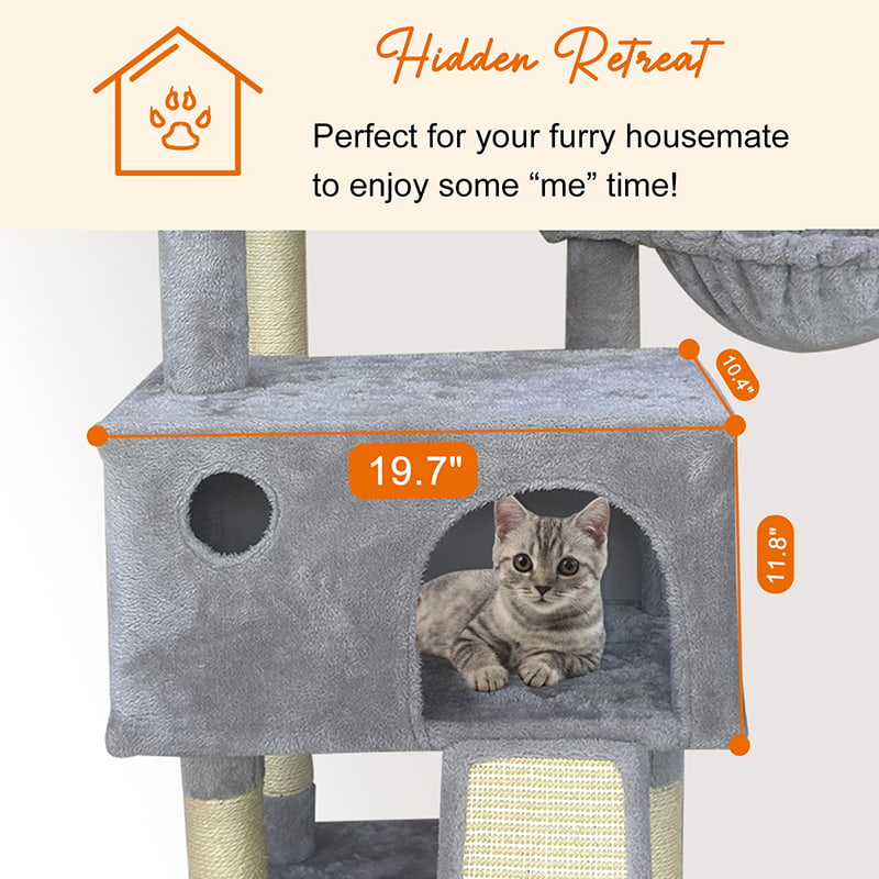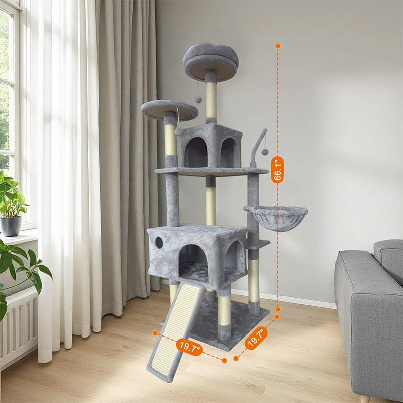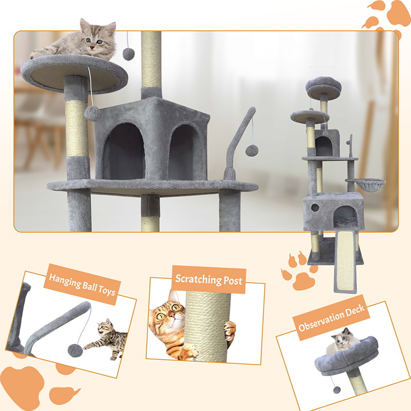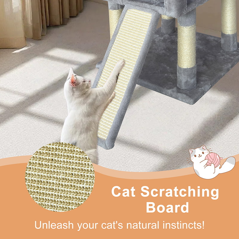 2. 舒适与乐趣兼得:配备两处加厚半封闭式毛绒窝,为猫咪提供柔软藏匿空间;结合吊床、悬挂毛球与剑麻抓板,打造集磨爪、嬉戏与小憩于一体的复合娱乐区域,满足猫咪日常行为需求。