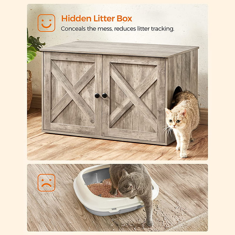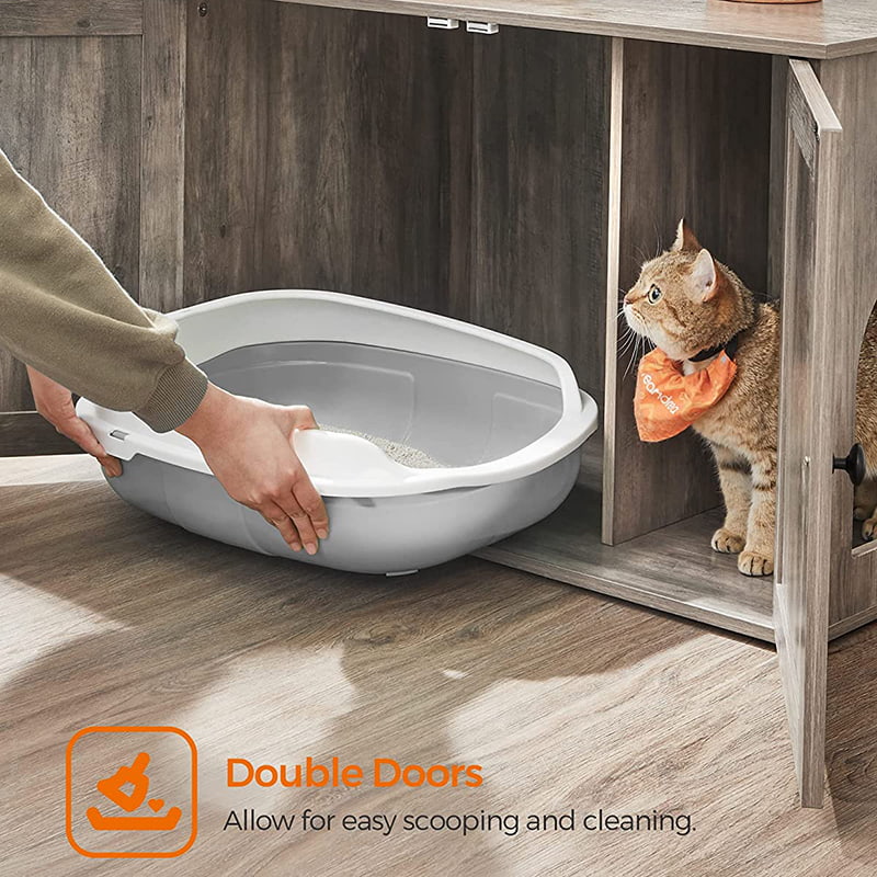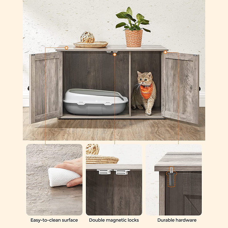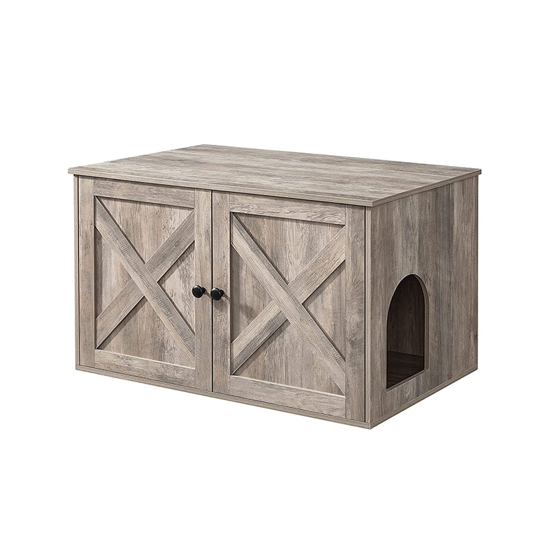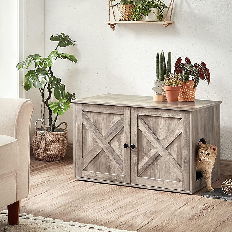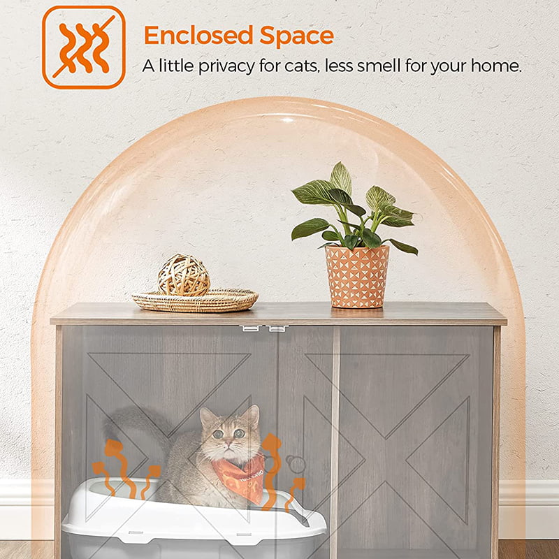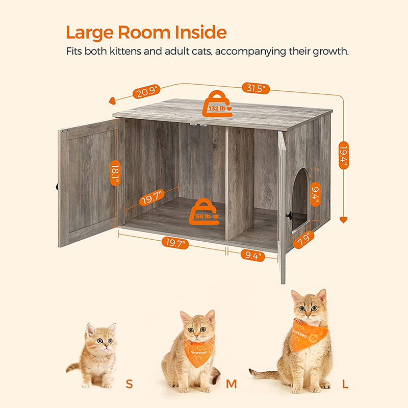 1.多功能生活空间:这款家具式猫笼采用环保刨花板制成,全封闭结构,为猫咪提供安全私密的休息环境。猫笼可灵活放置猫砂盆,前门+拱形侧门的双开门设计,方便猫咪自由进出。